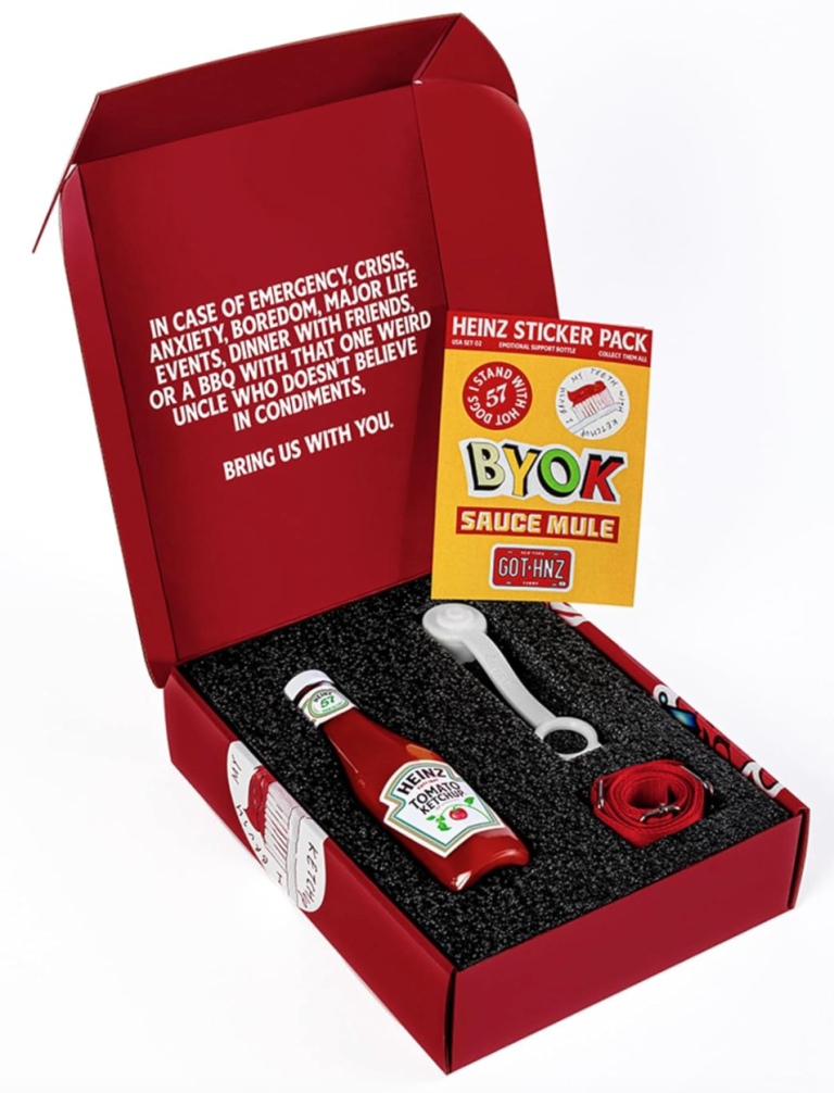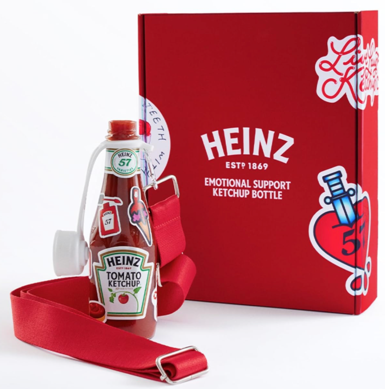 Exclusively offered on Amazon for a limited duration, the Heinz Emotional Support Ketchup Bottle showcases the renowned glass Heinz bottle, complete with a precisely fitted cap, personalized Heinz stickers, and a convenient carrying strap.