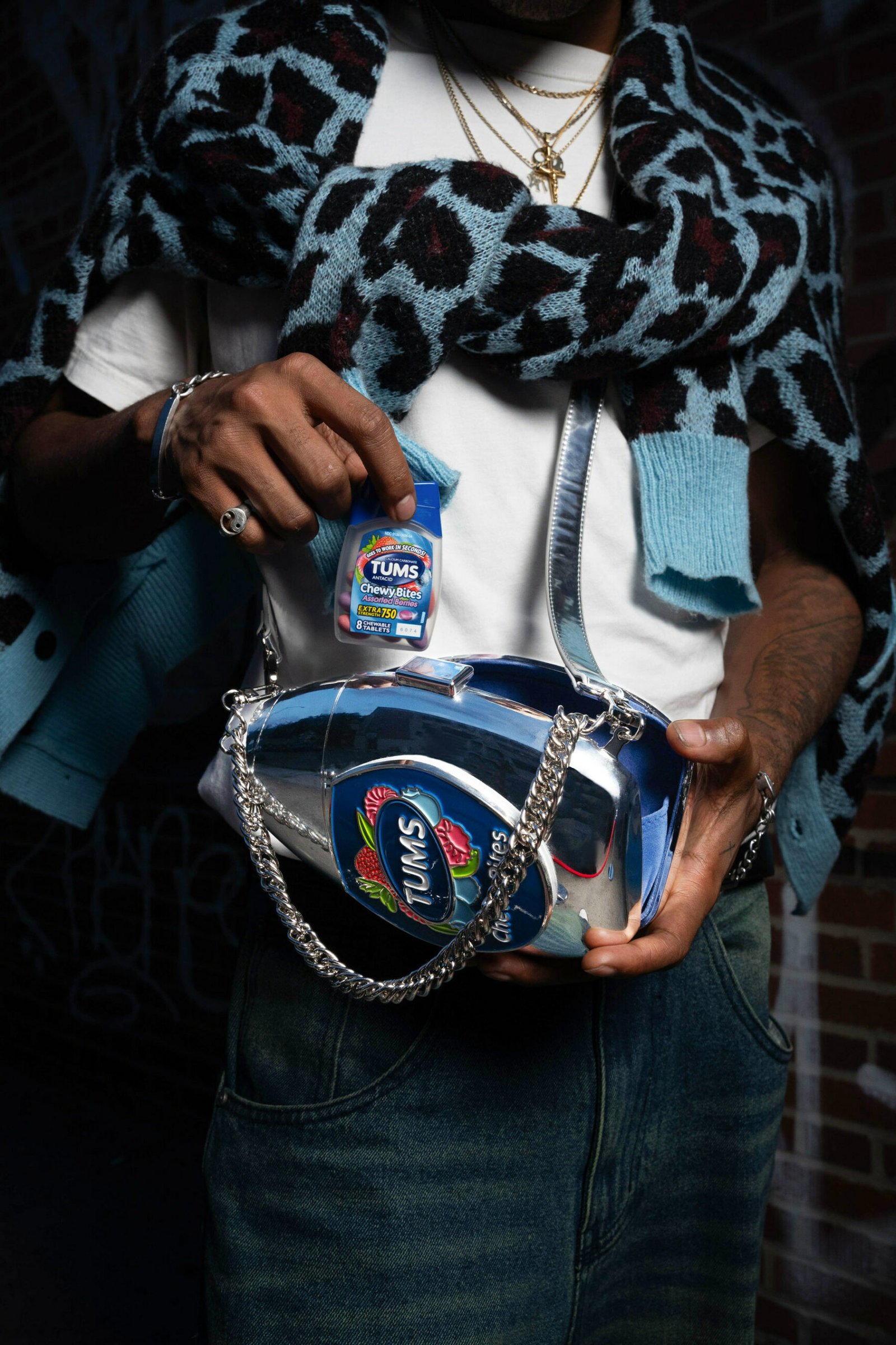 Inspired by the immense popularity of the TUMS Chewy Bites bottle, recognized as the leading antacid product in the United States and distinguished as the brand’s fastest-growing format, Nik Bentel immersed into one of the prevailing trends of the season to introduce the innovative TUMS Bag. Embracing the contemporary allure of metallics, this avant-garde accessory showcases a polished chrome finish, presenting a sophisticated and durable hard case exterior. The interior is luxuriously lined with high-quality blue suede, ensuring both style and substance.
