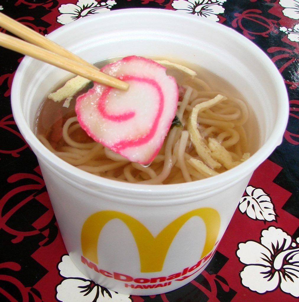 “Saimin is a soup with egg noodles served up in a hot broth that has kamaboko (fish cake), char siu (barbecued pork), and nori (seaweed). In the late 1960s, this Hawaiian Saimin was added to the regular menu as the first local “ethnic” dish added to a McDonalds in its long history.” –#HackTheMenu