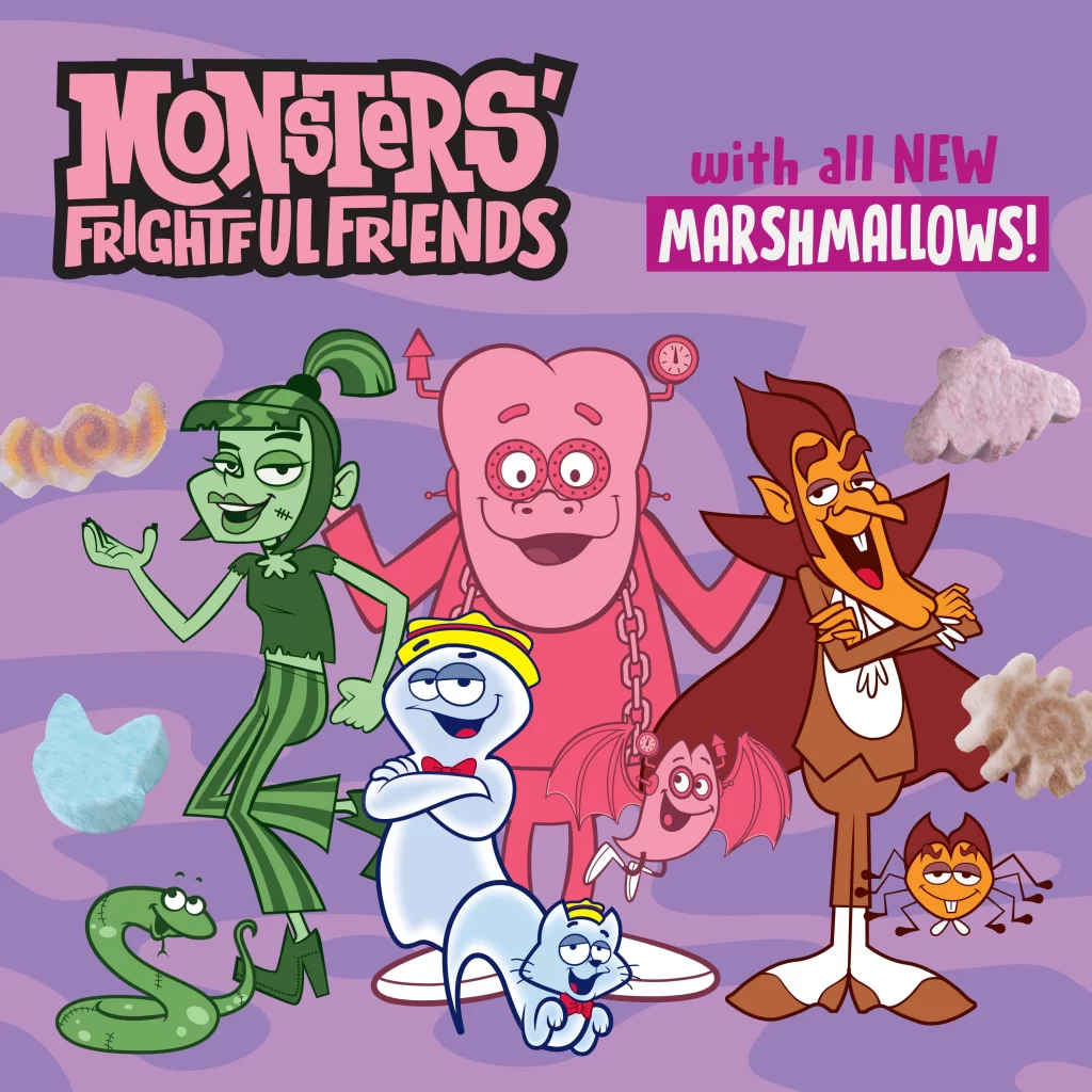 - Frightful Friends: It’s a spooky pet party! The Monsters Cereals you know and love are all joined by their scary sidekicks in this epic mashup of all frightful Monsters flavors, now with new pet-shaped marshmallows! From spiders to snakes, Monsters’ creepy critter friends are here to add even more mischief to Halloween.